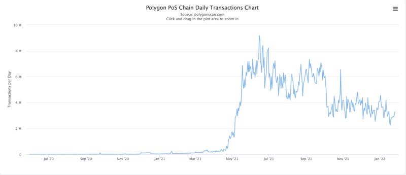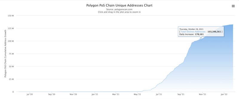 There are 135 million+ Polygon addresses. 5 million daily transactions. 76 million total transactions. 7000+ Polygon dapps. 2 million Polygon NFTs sold.